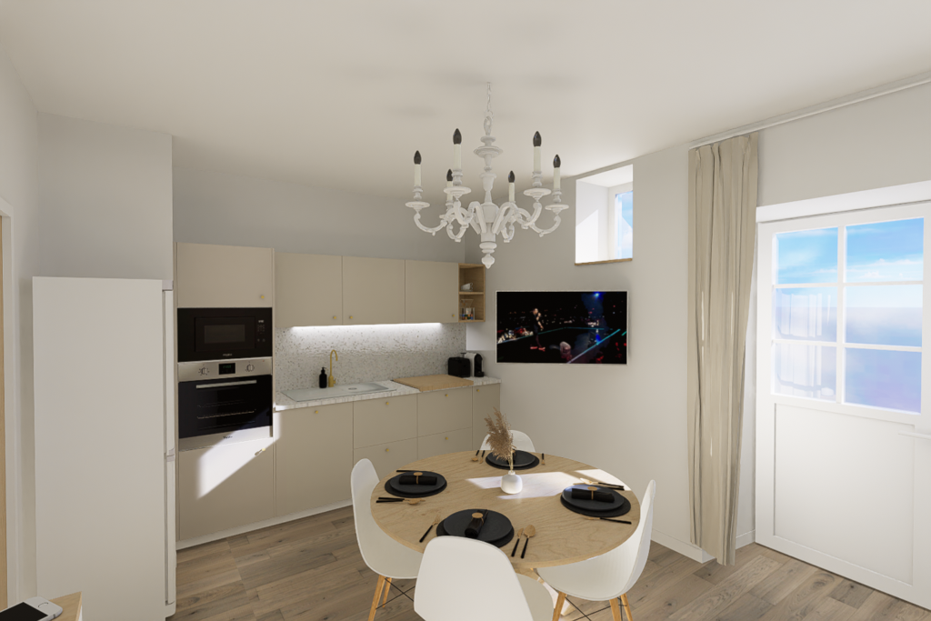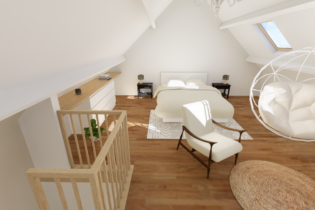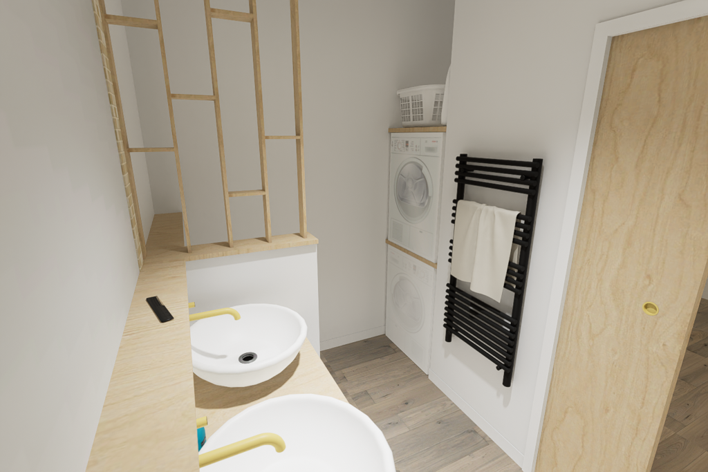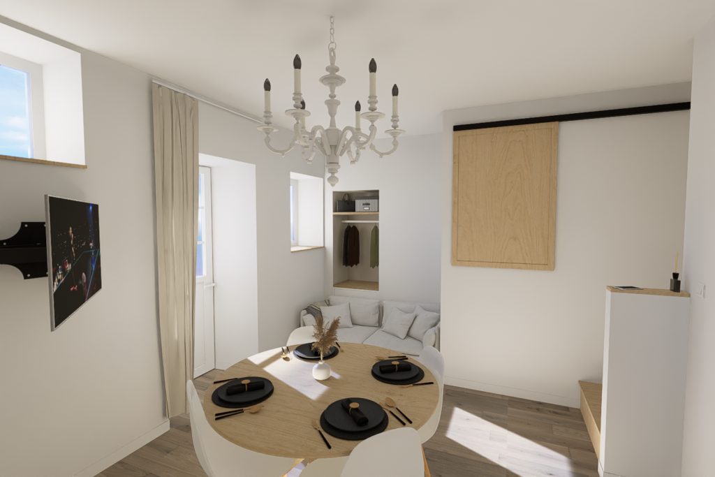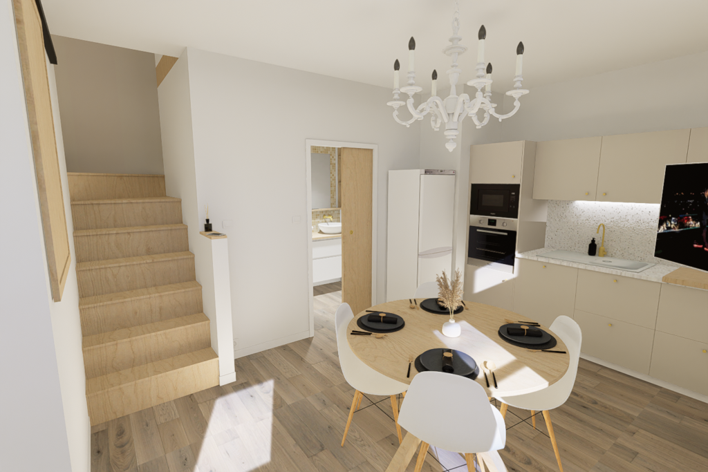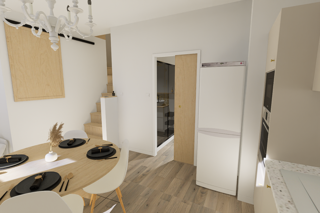 Pour la réalisation de ce projet, il a fallu imaginer un lieu de vie dans lequel tout été à réhabiliter, avec de la démolition, l’implantation d’un escalier, et le dessin d’une cuisine ainsi que d’une salle d’eau, dans le but de créer un logement complet et indépendant.